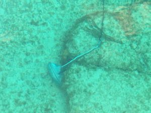 There’s a very light wind again today maybe only 5 or 6 kts, directly on the nose just like it always is. Two of us are motoring and one of us is motor-sailing with his main up. There has actually been very little sailing for us on this “sailboat” so far. As we turned the corner and headed more to the east, we managed to get enough wind to unfurl the genoa and motor sail a bit. The furling line got a bit mangled in the drum, so that gave me something to do as we slowly made our way east at approx 5.5kts. We eventually pulled in close to shore near Lucaya and dropped anchor at 1500. The sea bed is at both West End and Lucaya is something the our cruising companions call “marley.” A combination of rock and hard sand, so you have to pick your spots carefully. We got the anchor to dig in very quickly on our first try, and we managed to stick it under a rock, as you can see in the picture. The water is so clear here you can see that through 13′ or so of water.