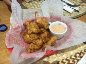 One of the restaurants that gets good reviews from tourists and sailors alike is Lorraines Café, located right on main street with most of the other businesses. We stuck our head in on the way by to take a look while we were still on our recce and it already had 10-12 cruisers early in the afternoon, a good sign. After we finished our walk we went back for a late lunch. Yes…we did order conch fritters. They are a bit of a cliché here, but it does give you a chance to see what each place does to make them unique. These ones, known as “Lorraine’s World Famous” were actually some of the better ones we tried. Very little conch actually in them, but the batter was surprisingly tasty. Service was very slow, but you come to expect that in The Bahamas. Lorraine’s was a large facility compared to most places we’ve been in, with several large screen TVs (showing American programming), and a substantial outdoor seating area. We were happy to be out of the sun and in a/c.